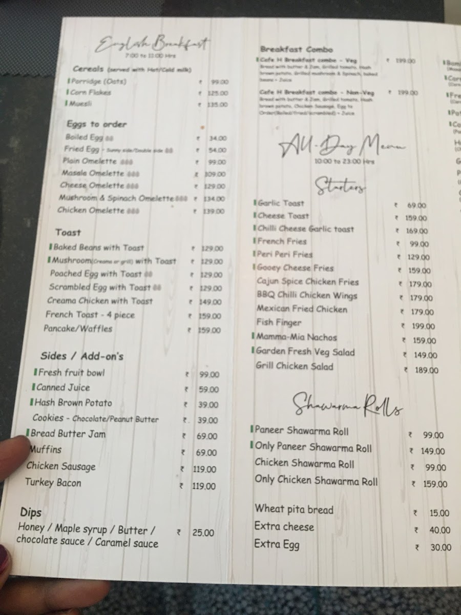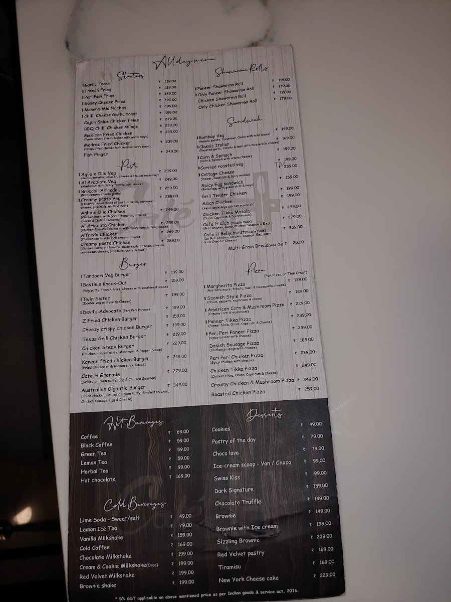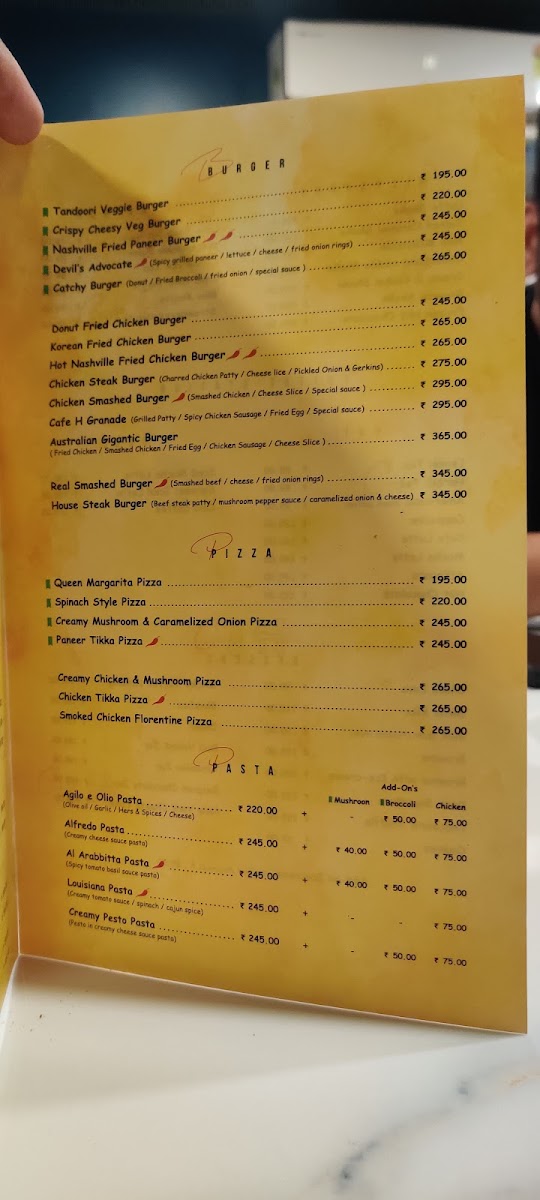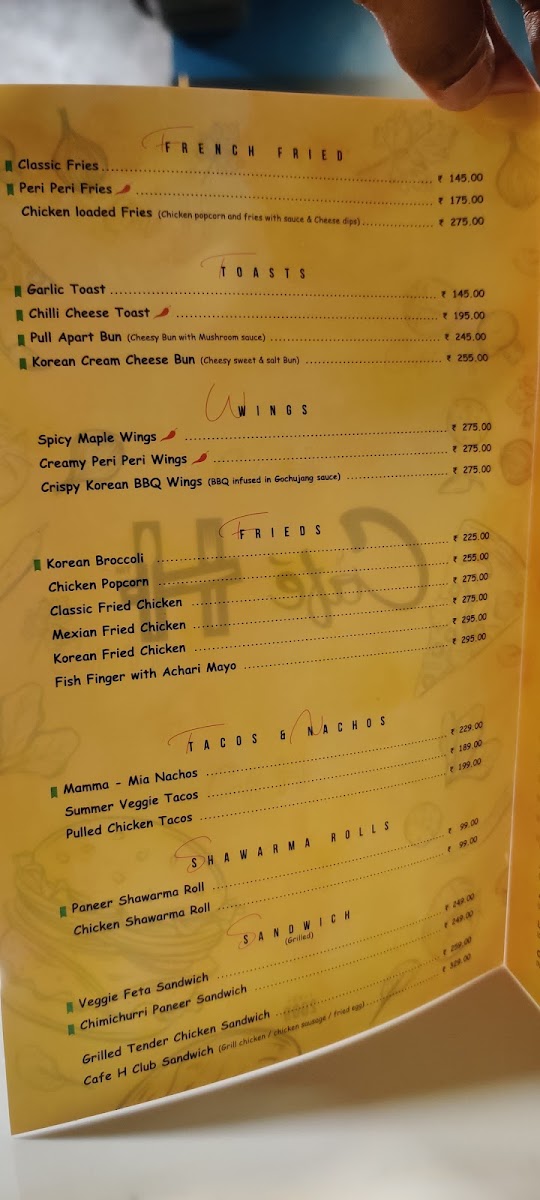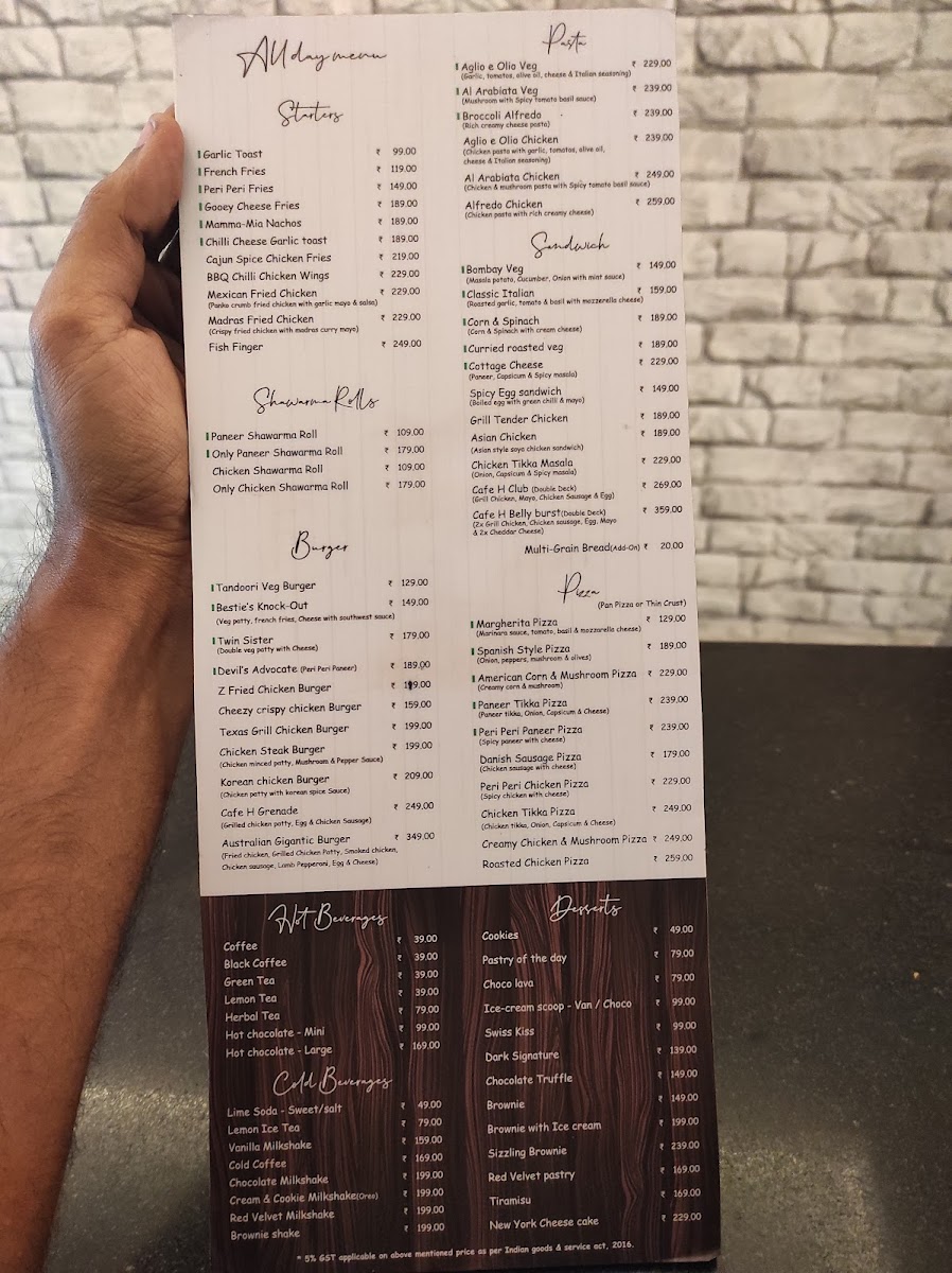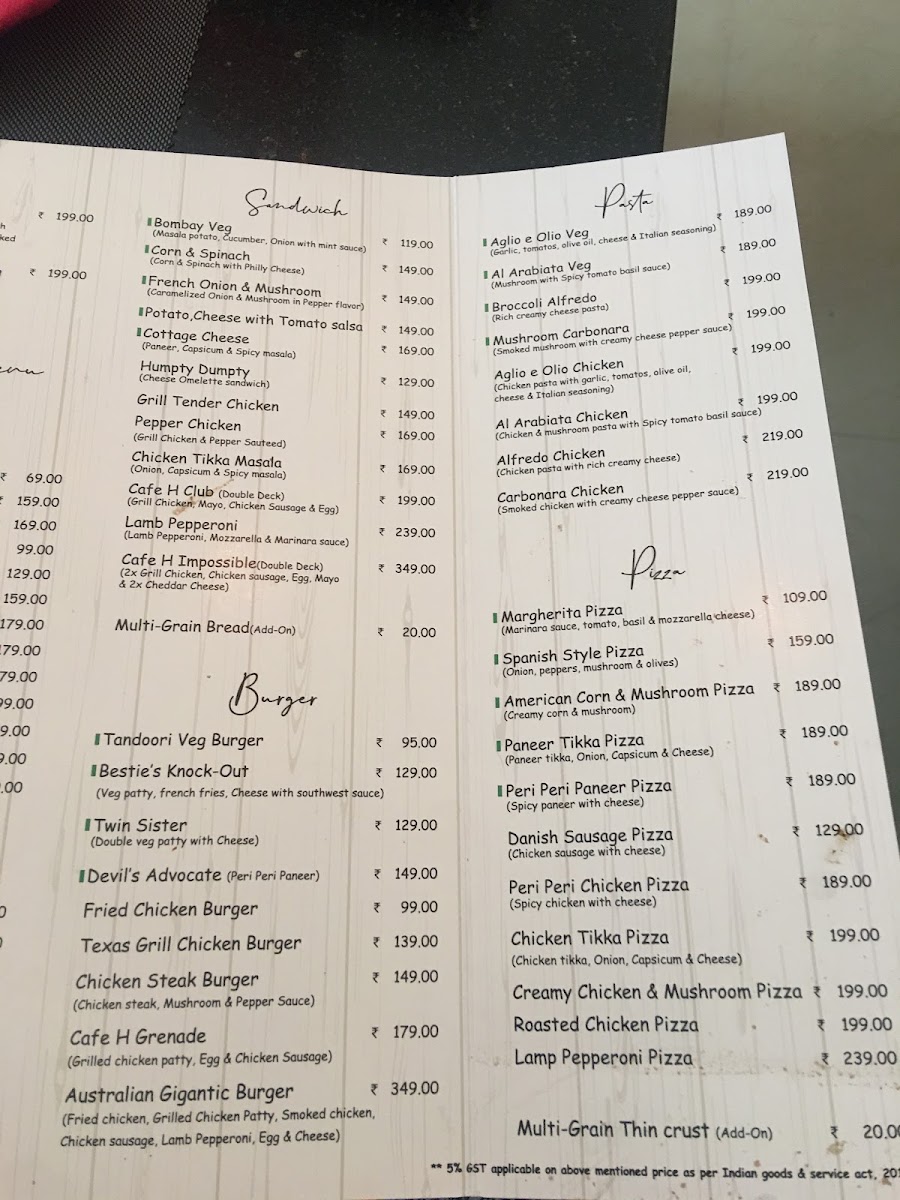The menu at Café H is an eclectic mix of crowd favorites. Indulge in their soft, freshly made pizza, or savor the world-class cheese garlic bread that melts in your mouth. Don't miss the lousiana pasta or the loaded fries, both celebrated for their bold flavors and satisfying textures.